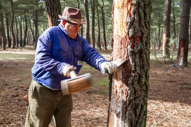 Mediante incisiones en la corteza del tronco, los resineros extraen la resina o la miera de los pinos entre marzo y noviembre y la guardan en bidones de unos 200 kilos. Estos bidones son trasladados a fábricas en donde se destila el contenido para obtener colofonia y aguarrás, dos componentes con numerosos usos en la industria química, tales como la fabricación de jabón, papel, barniz, tintas de impresión, compuestos de goma, revestimientos superficiales, barnices, pinturas, esmaltes, fuentes de aromas, fragancias, insecticidas, disolventes…